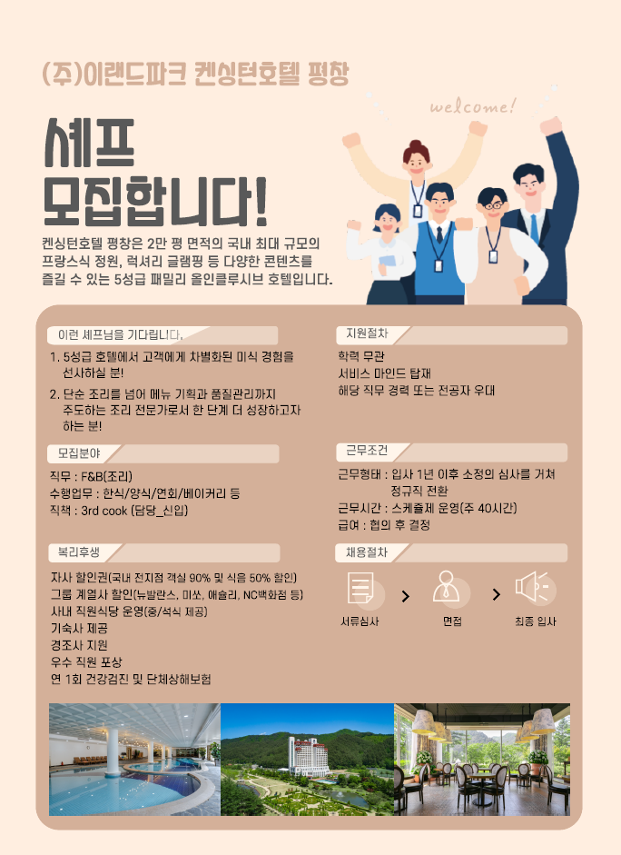 강원도 평창에 위치한 5성급 패밀리 올인클루시브, 켄싱턴호텔 평창에서 미식의 가치를 함께 만들어갈 열정 넘치는 조리 인재를 모집합니다.